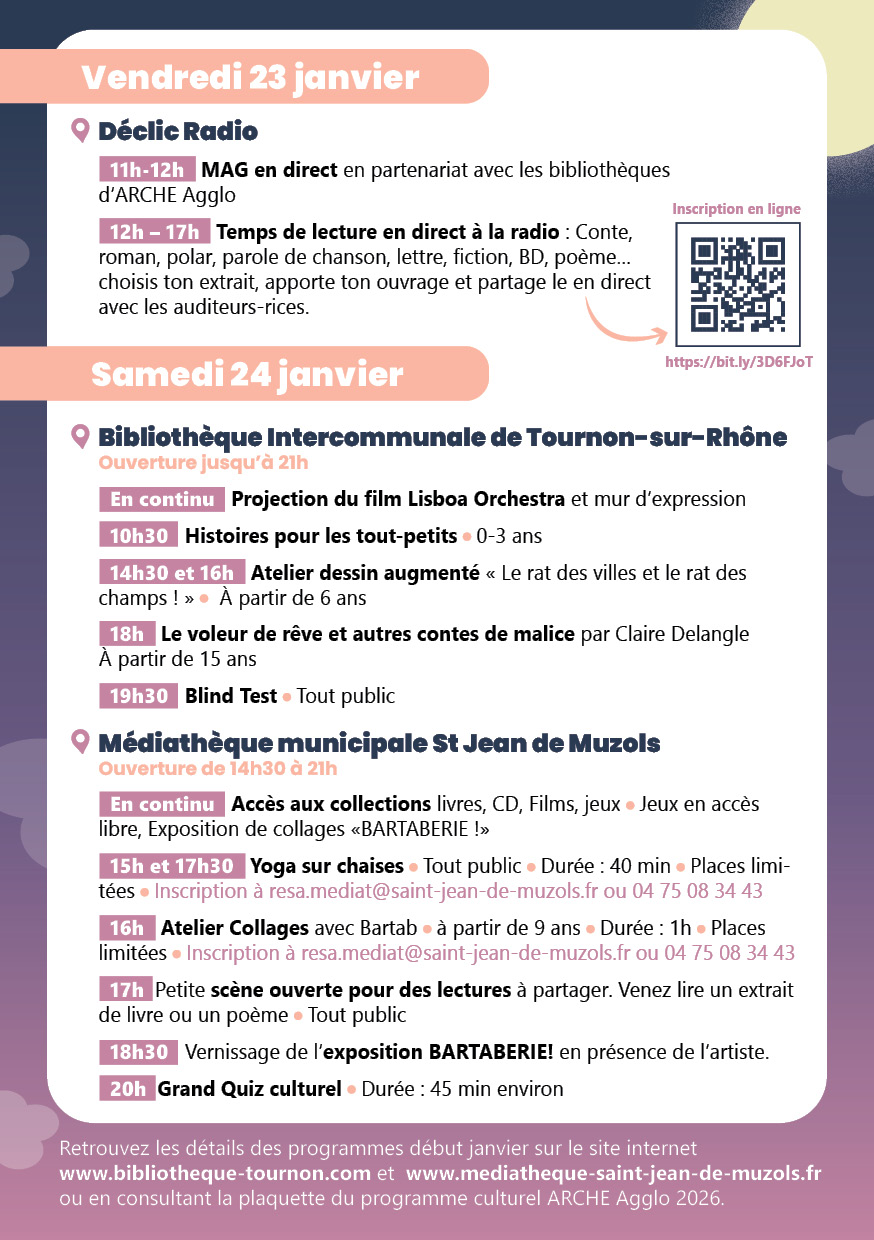La bibliothèque intercommunale de Tournon-sur-Rhône, la Médiathèque municipale de Saint-Jean-de-Muzols et Déclic radio vous propose un programme d'activités sur deux jours.